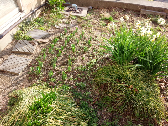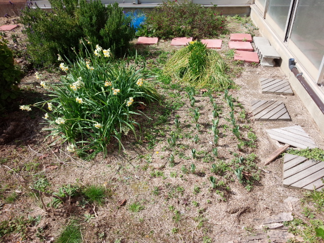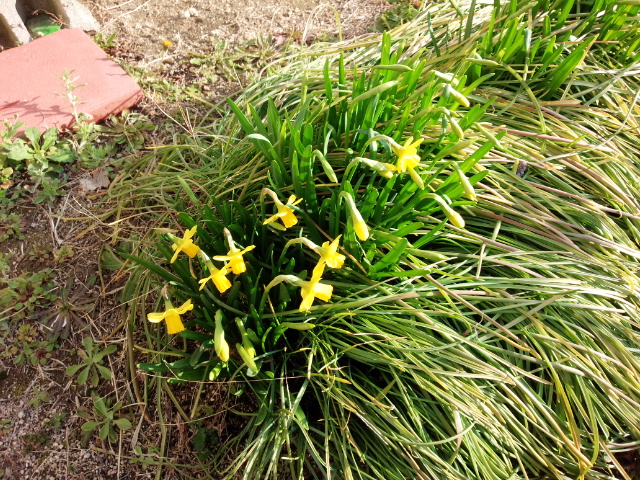 奥の煉瓦のところには黄色い水仙の花が咲いていました。奥の方に咲いているのでなかなか気づきませんでした。部屋の方から眺めるように植えているのでしょうか?