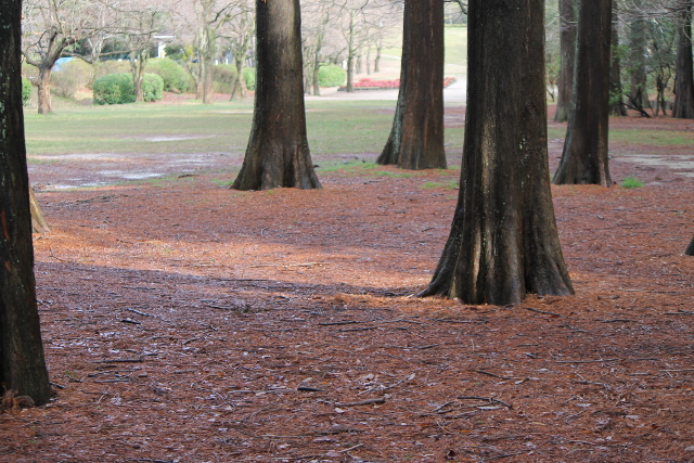 千里中央公園の木立のゾーンです。朝の光を浴びて赤っぽい地面が明るくなってきました。