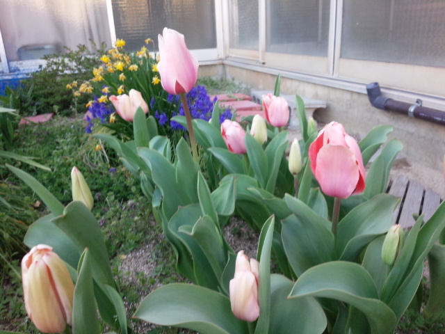 今朝一番に朝日を浴びているチューリップの一団を撮影しました。