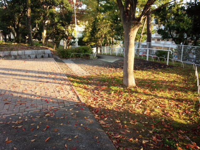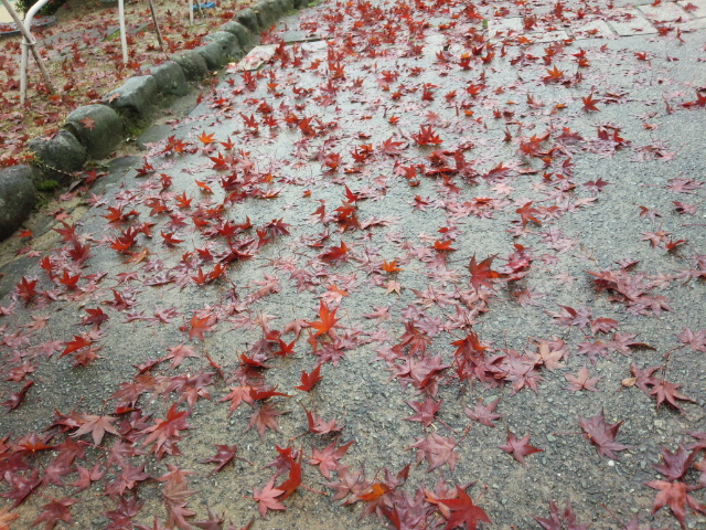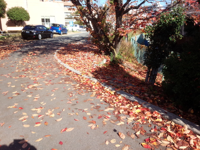 桜(さくら)の葉(は)っぱも真っ赤(まっか)になってこちらは土(つち)を赤(あか)く染(そ)めていました。
