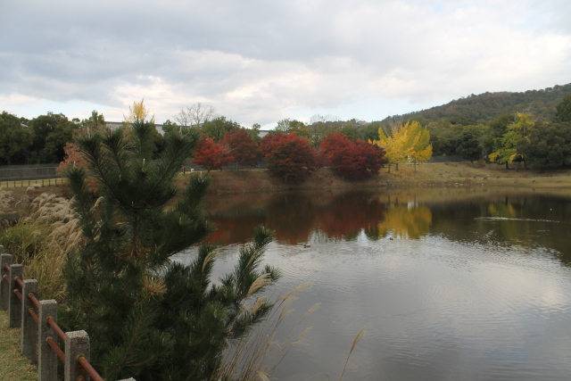 奈良市内(ならしない)の東大寺(とうだいじ)の横(よこ)、若草山(わかくさやま)ドライブウェイに通(つうじる)じる道路(どうろ)に赤(あか)や黄色(きいろ)の紅葉(もみじ)が美(うつく)しい池(いけ)がありました。調(しら)べてみましたが、何(なん)という池(いけ)かはわかりませんでした。