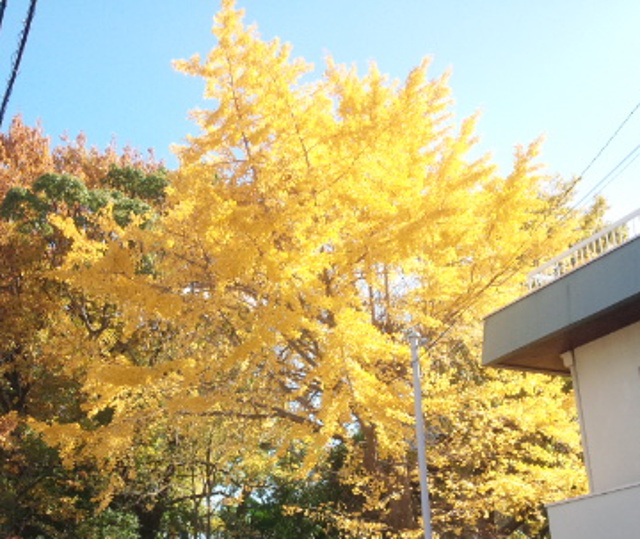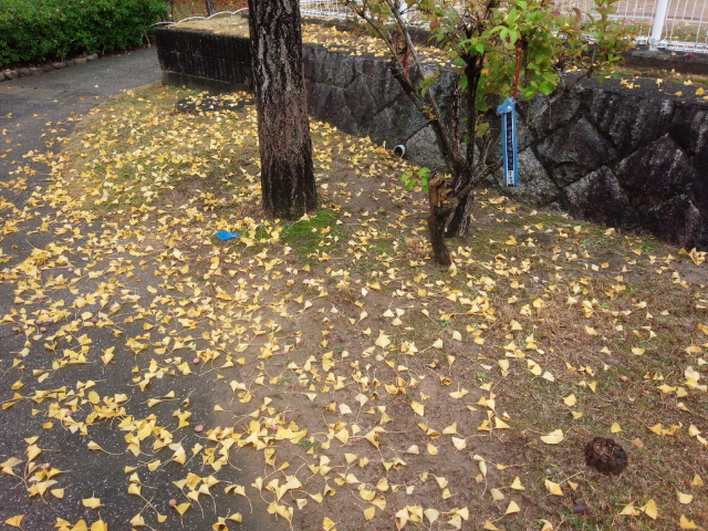 イチョウの落ち葉(おちば)がきれいに巻(ま)かれたように散(ち)っていました。朝(あさ)の雨(あめ)でたたき落(お)とされたのかも知(し)れません。それでも一枚(いちまい)一枚(いちまい)水洗(みずあら)いされたように綺麗(きれい)になっていました。