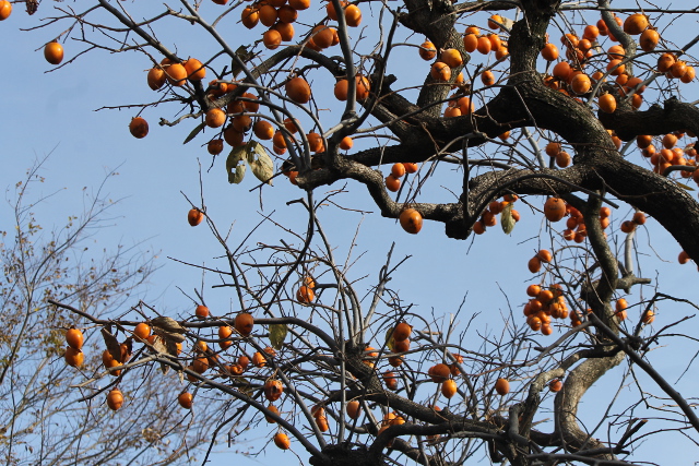 この柿(かき)の実(み)は渋柿(しぶがき)なのでしょうか?木(き)の幹(みき)や枝(えだ)のごつごつした感(かんじ)じと対照的(たいしょうてき)な鈴(すず)なりの丸(まる)い柿(かき)の実(み)が冬(ふゆ)の空(そら)を背景(はいけい)に清々(すがすが)しい景色(けしき)に見(み)えました。