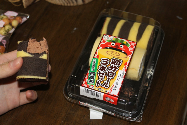 閉店前のスーパーに巻き寿司が売れ残っていないかと立ち寄ってみたのですが、すべて売り切れでした。このロールケーキのセットがケーキのコーナーに数個残っていました。