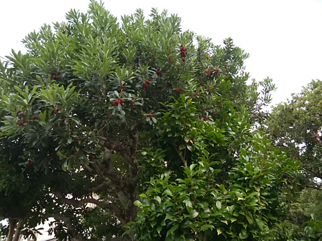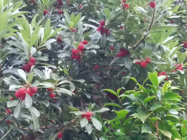 今年もまた、ヤマモモの実があちこちの道に散らばるようになりました。気になっているときにはおいしそうな赤い実なのですが、地面に落下して赤黒く変化し始めるとただのゴミよりもちょっと手がかかる代物なんです。できるだけ踏まないように歩くのですが、踏まなければ通れない道もありました。