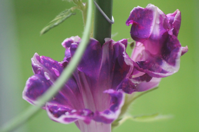 朝からの雨にも負けずむらさきの朝顔が開花しています。「肥後の手まり」です。
