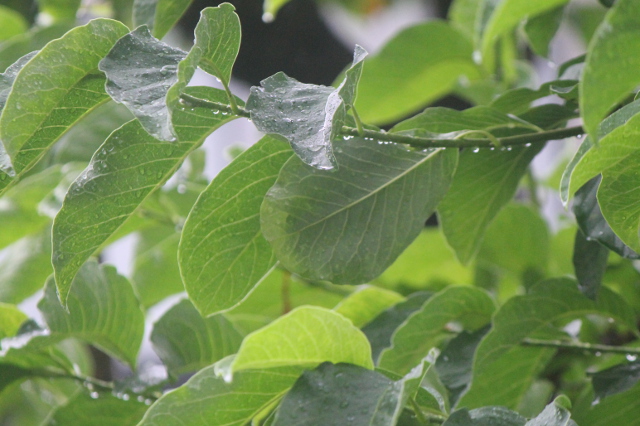 目の前の大きな木がすっかり雨に濡れて葉っぱが瑞々しく、風に揺れていました。