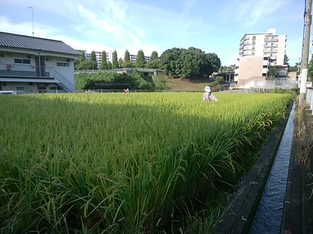 稲の穂が伸びて立派になっていました。案山子が二体、一生懸命に働いていました。この前と同じように一つの株に稲穂がいくつあるか、数えてみましたが、5本ぐらいでした。