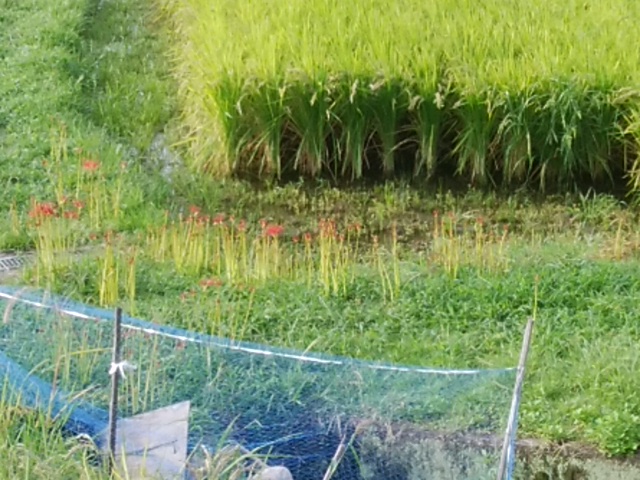 不思議なことにこの田んぼには網がかかっていません。横の田んぼや奥の方の田んぼには鳥よけの網がかかっています。どうしてなのでしょうか?