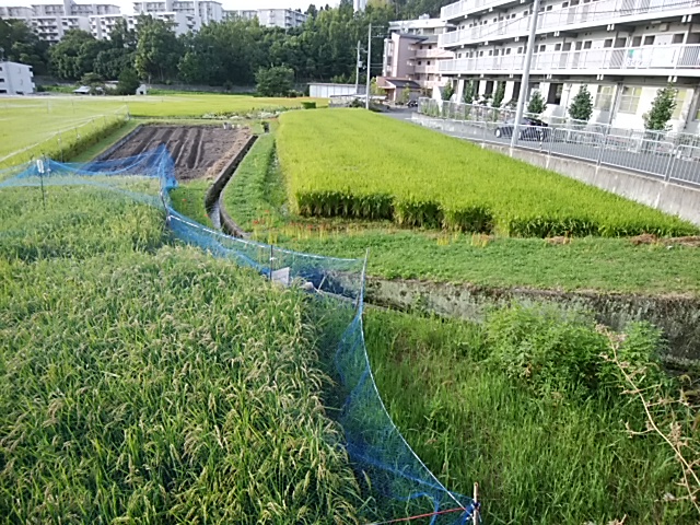 稲の穂が垂れ下がってそろそろ収穫の時期が来ているようです。薄い網を前面に張って雀の被害を避けているようです。