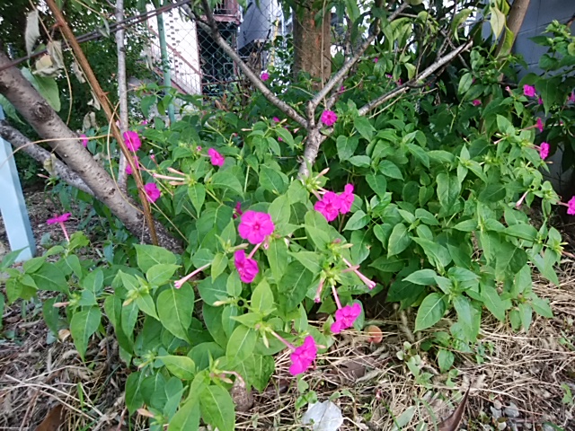 オシロイバナがきれいな色で咲いていました。紅い色が夕方の光の中で目立っていました。この花を引っ張って、付け根の所をなめると甘い蜜の味に出会いました。幼き日の思い出です。