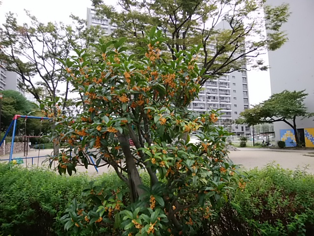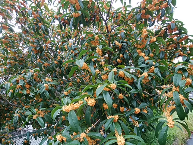 金木犀の花が見事に咲いています。金木犀と書いてキンモクセイと読みます。樹皮の模様が動物の犀(サイ)の皮に似ていることから漢字ではこのように書くそうです。