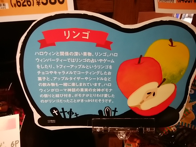いよいよハロウィンが近づいてきました。ハロウィンとリンゴの関係を教えてくれる店内広告です。ローマ神話の果実の女神ポーモーナの祭りと結びついているというのを初めて知りました。