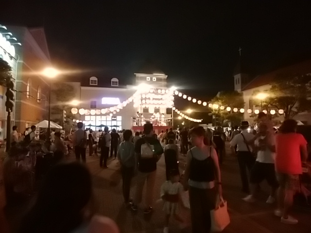 つかしんの夏祭りです。西町の方の広場にやぐらがたてられて、その上で太鼓を叩く人と踊りを踊る人がいました。そのやぐらの周りには踊る人の輪ができていて気持ちよくみんなが盆踊りを踊っていました。