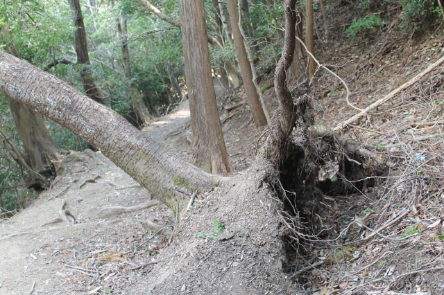箕面の山の中でよく見かける倒木です。根こそぎ倒れているので、ところどころ道を塞いでいました。地盤が緩んできたのでしょうか?それともナラ枯れという病気のせいでしょうか?
