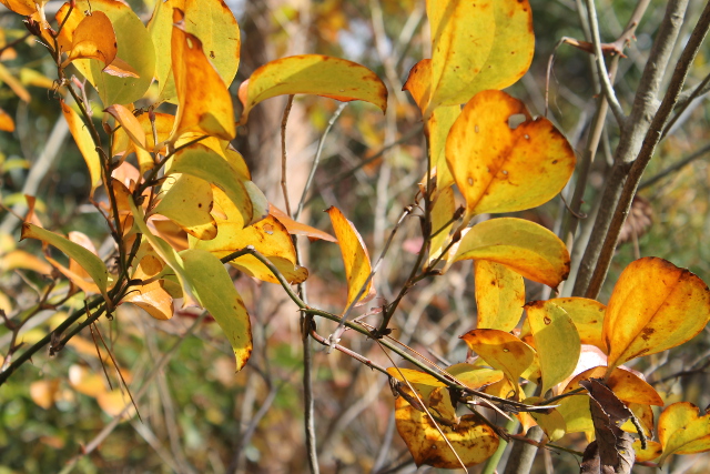 山(やま)の中(なか)で見(み)かけた黄色(きいろ)い葉(は)っぱです。黄色(きいろ)と茶色(ちゃいろ)の色(いろ)がいい感(かん)じで溶(と)け合(あ)っていました。