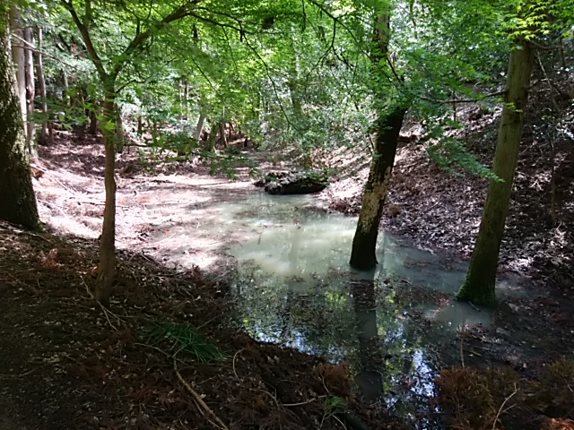 しらみ地蔵の前に青い池ができていました。かなりの雨が降った日の翌々日の山歩きの時の写真です。山道にもまだ水が残っていて時折水が流れて歩きにくい箇所もありました。