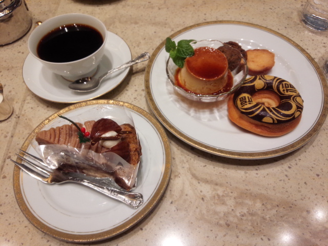 これは昨日西宮ガーデンズの1っかいにある喫茶店『丸福』のケーキセットです。プリンとドーナツとラスクがお皿の上に載っていました。丸に福の路が入ってるドーナツってちょっと面白いですね。クリスマスということでモンブランのケーキをいただきました。