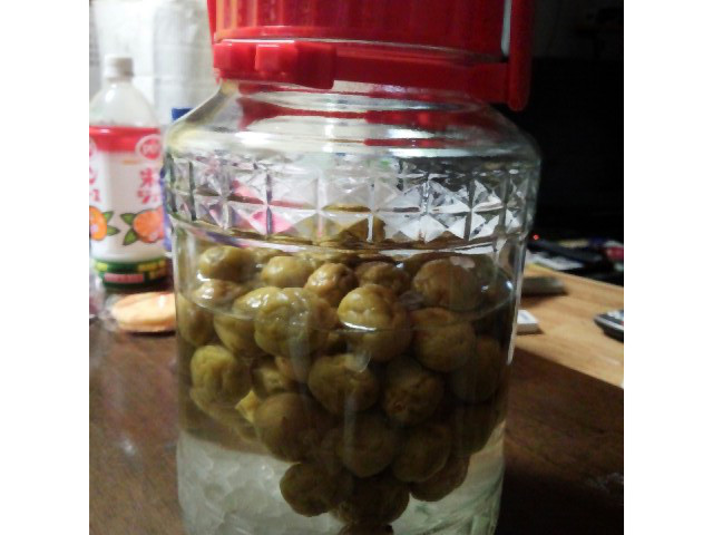 一週間経った梅ジュースです。氷砂糖は溶けきっていませんが、かなり水分は梅の実から出てきています。氷砂糖が溶ければ出来上がっていると思います。