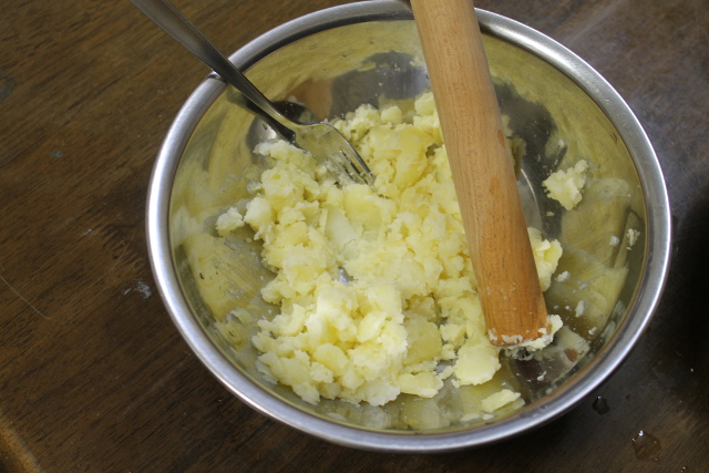 コロッケを作(つく)ろうということになりました。まずジャガイモをゆがいて熱々(あつあつ)の状態(じょうたい)で皮(かわ)をむきます。そのジャガイモを粗(あら)めにつぶしました。