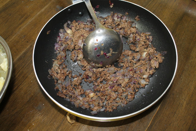 こちらは牛(ぎゅう)ミンチとタマネギをフライパンで炒(いた)め、塩(しお)こしょうなど調味料(ちょうみりょう)をプラスします。