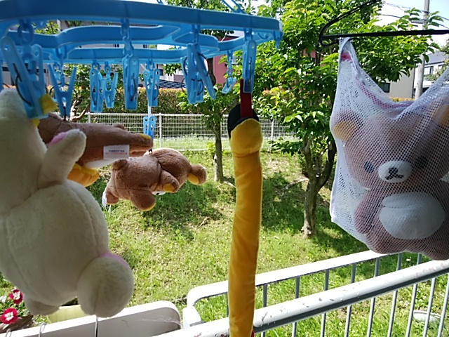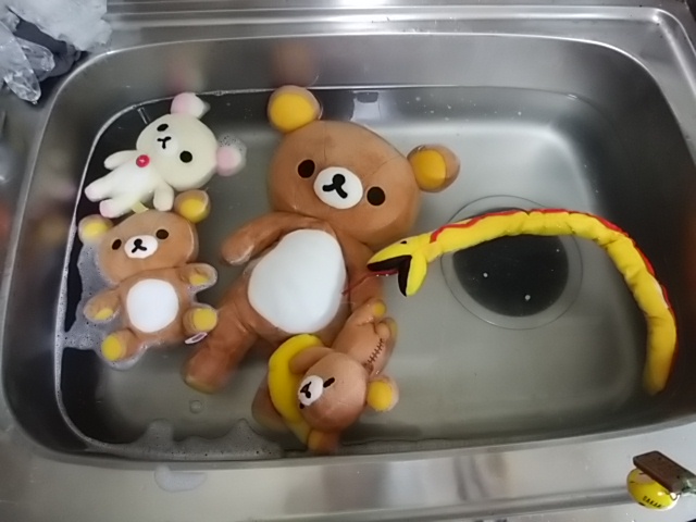 じめじめした梅雨の季節ということもあり、この前おなかの辺りが黒く汚れていたリラックマのぬいぐるみを洗ったのですが、他にも汚れていないかと点検した結果、リラックマ3体、コリラックマ1体、ヘビさん1ぴき合計5体に黒っぽい汚れが見つかり、急遽洗うことにしました。