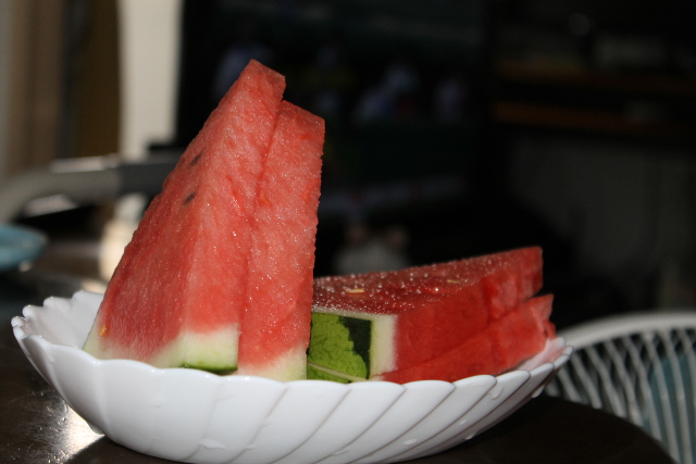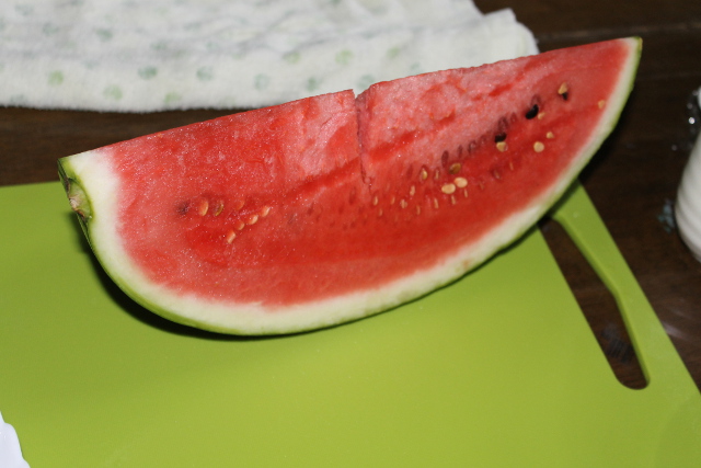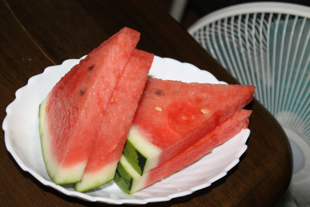 近所のスーパーでスイカを買いました。八分の一に切れたのが二重にラップされて「早く買ってくれ」と言っているように聞こえました。
