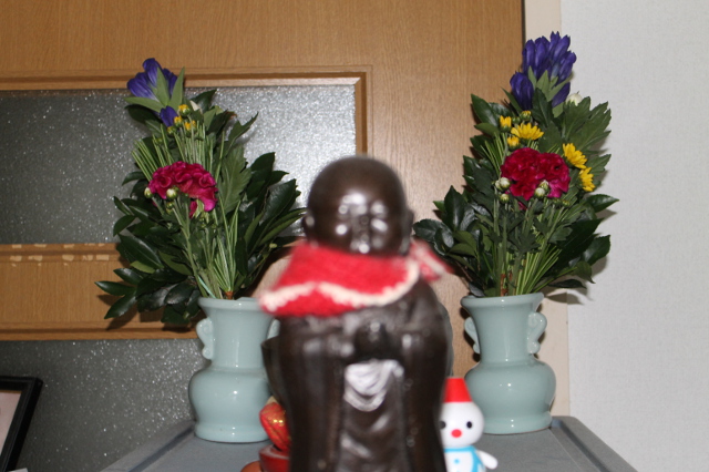 マルヤスの玄関のところにいろいろな花が並べてあり、一番きれいな花を手に取ったのですが、昨年茎の長い花束を買って花入れに生けるのに苦労したことを思い出しました。ここは一番、仏花というのを買ってみようと手にしたのですが、これがきれいな花束よりも高いのですね。やはり対で買うべきだろうと決心し、一つ780円の仏花を二つ買うことにしました。