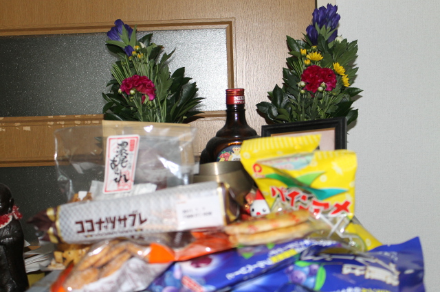 家に帰って並べてみたのですが、やはり何かお供えをした方がいいのではと思い、家の中にあるお菓子のたぐいを並べてみました。