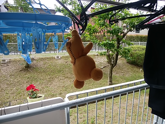 よく水を落として、足の先にある白いわっかになった布を利用してハンガーに引っかけて干してみたのですが、犬神家の一族の1シーンみたいになったので、やさしく横にしてあげました。