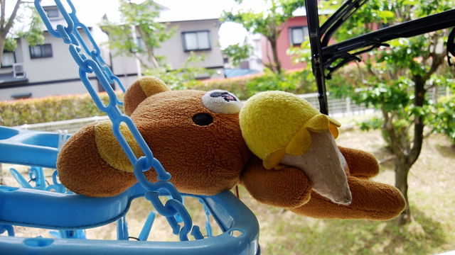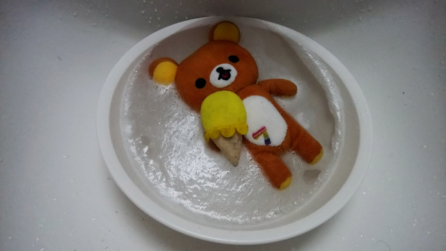 7周年記念のアイスクリームを食べるリラックマが少し汚れてきたので、洗面器にお湯と洗剤を入れて手洗いしました。不思議なほど黒い水が出ました。かなり汚れていたのでしょうね。