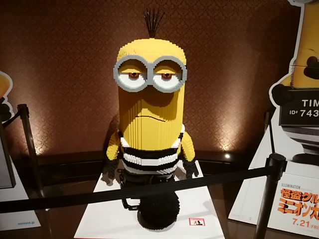 映画館入り口で見かけた巨大なミニオンです。ブロックで作られていました。