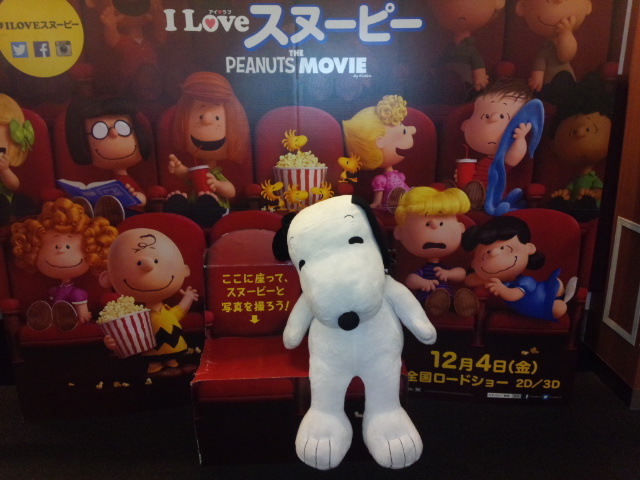 箕面の109シネマズの玄関に大きなスヌーピーがモデルのように立っていました。いや座っていたのかな。