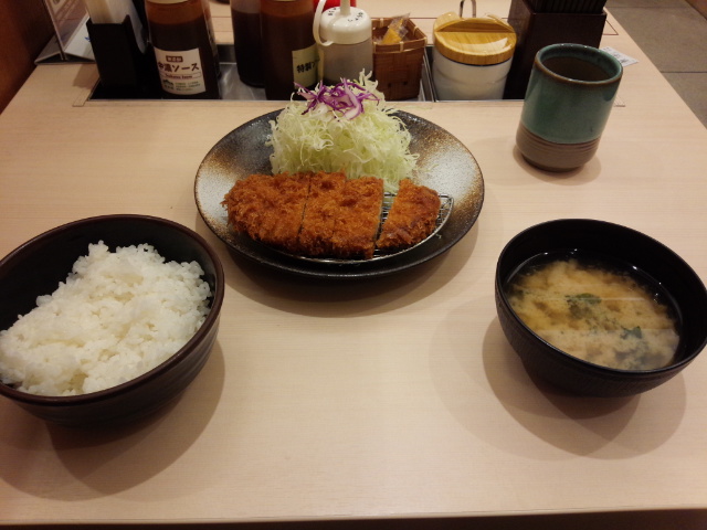 帰りに池田で食べた「松の屋」のロースカツ定食(500円)です。