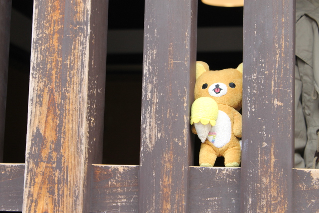 『ならまち』の「格子の家」から外を眺めるリラックマです。