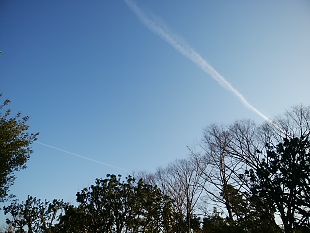 3月7日、午前7時42分に撮影した2本のひこうき雲です。目が覚めるような青空にふわふわになりかかったひこうき雲が線を引いていました。