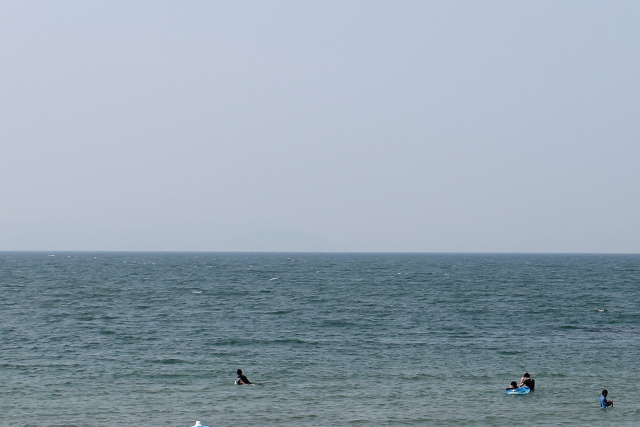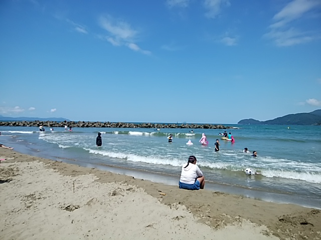 秋の海と同じように6月の海も人影少なく、寂しい浜辺でした。それでも何人かの人が浜辺で水遊びをしていました。
