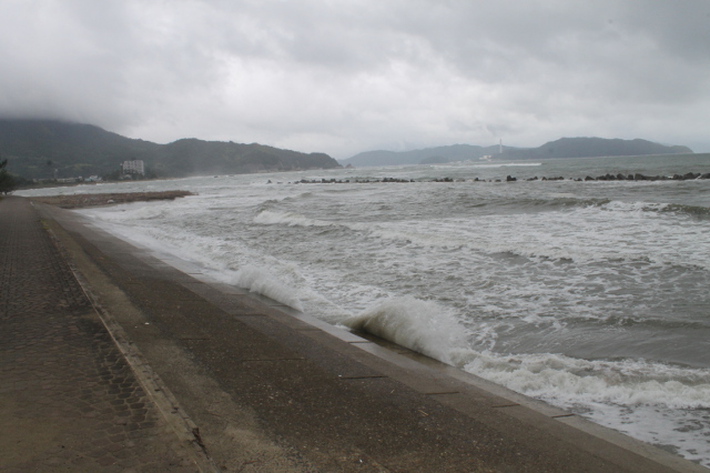 海を見て驚きました。台風の影響かすごい波で誰も泳いではいませんでした。