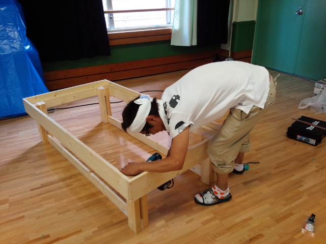 手作(てづく)りベッド製作中(せいさくちゅう)です。コーナンで材木(ざいもく)を買(か)ってきて決(き)められた長(なが)さに切(き)り、重(おも)さに耐(た)えられるよう計算(けいさん)して製作(せいさく)しているそうです。