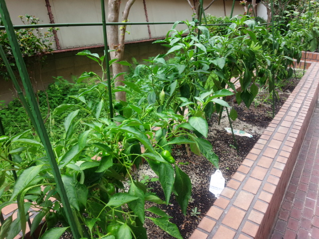 病院(びょういん)の中(なか)の食堂(しょくどう)の外(そと)に作(つく)られた自家菜園(じかさいえん)です。