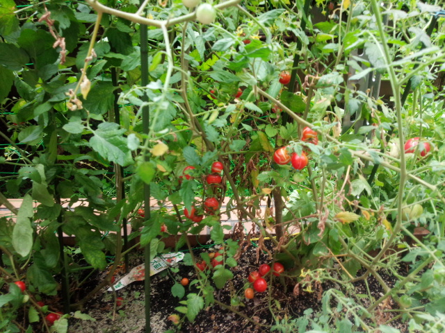 ミニトマトもたくさんなっていました。今日(きょう)は自家製(じかせい)のピーマンとオクラをいただきました。