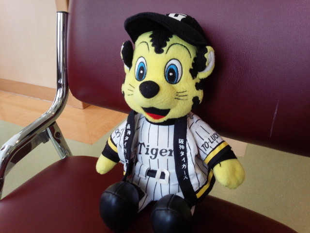 トラッキーのぬいぐるみがにこにこと喜んでいました。今朝はタイガースがジャイアンツに連勝し、久し振りにカード勝ち越しを決めました。