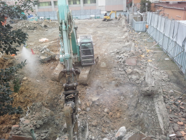 コンクリートクラッシャーがでっかいコンクリートの塊を細かく砕いていました。ガラガラゴロゴロ大きな音を立てて活動していました。後ろの方から水をかけているのですが、クラッシャーが作業しているところまでには届かないようです。