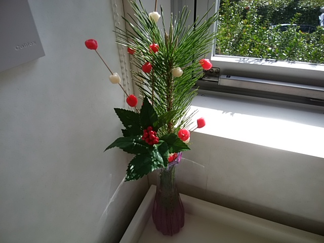 病院の洗面コーナーに松ともち花が飾られていました。紅白の小さな丸いもち花に懐かしさを感じました。