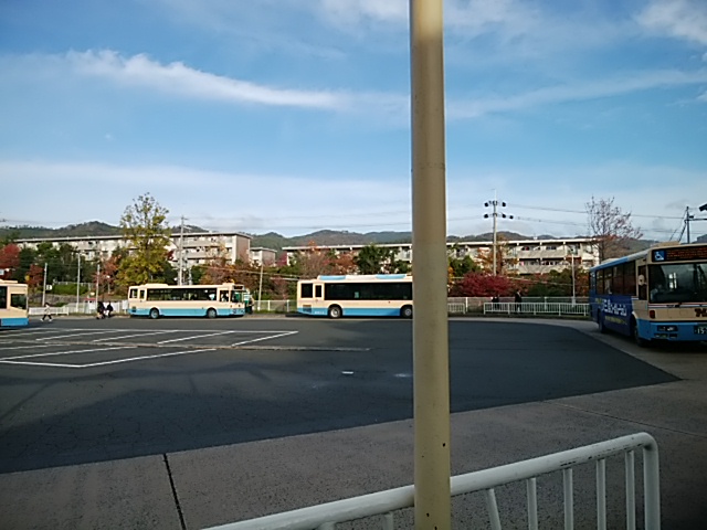 阪急バス粟生団地のバス乗り場です。この清々しい写真ではよくわからないと思うのですが、このバス乗り場いろいろな施設がこの夏の台風で吹き飛ばされたままになっています。