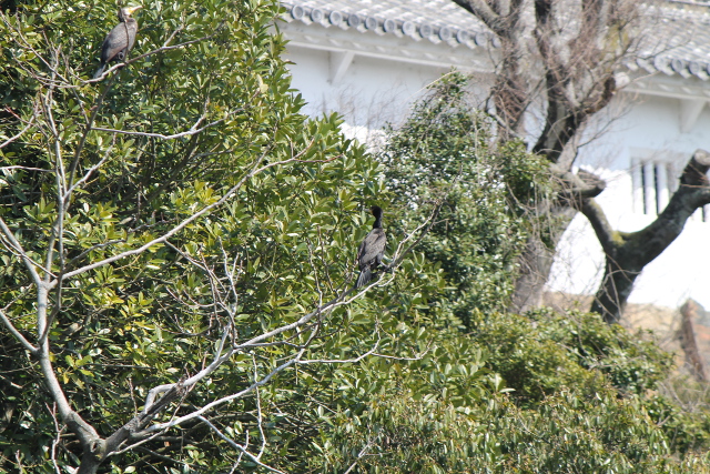 姫路城の白壁をバックにして木の枝に黒い鳥が留まっているのが見えますか?おそらくカワウと思うのですが、あんな高いところに留まって何をしているのでしょうか?