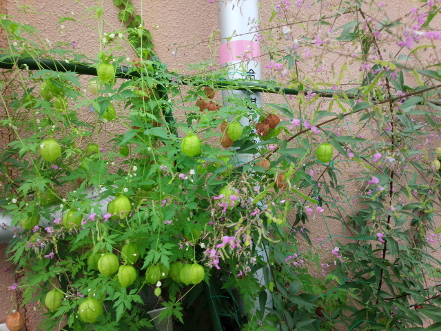 まだまだ青い風船がたくさんぶら下がっているのに、小さくしぼんだ茶色の風船もたくさん増えてきていました。ただこの種を採るために引っ付き虫がТシャツにたくさんついて困ってしまいました。