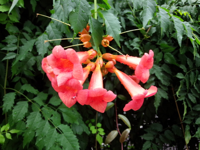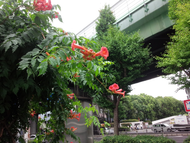 森之宮のノウゼンカズラの花です。前回は6月15日のブログに登場しているのですが、今日は7月26日です。寿命の長い花なんですね。ラッパをあちこちに向けてどの花も元気よく音を鳴らしているようです。