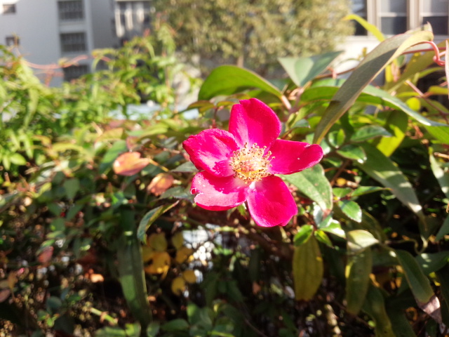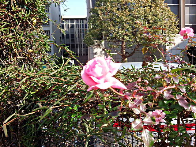 森ノ宮のUR住宅内の花壇の花もやはり少なくなってきました。そんな中でピンクの薔薇の花が美しく咲いていました。朝見かけてお昼に撮影したものですから冬の陽射しをまともに受けて輝いていました。