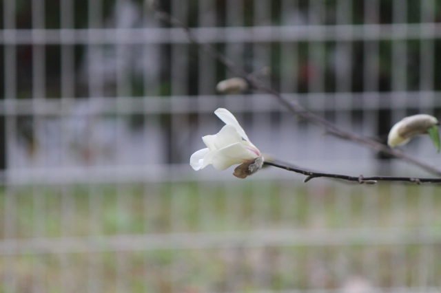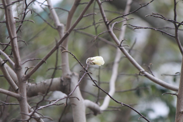 ベランダから外を眺めると木蓮の花が咲いているのが目に入りました。あちらの木に一つ、こちらの枝に一つという具合に木蓮の花は孤独でした。遠くで鳥の鳴き声がしましたが、姿を見せることなくカメラを構える私は朝の寒さで震えてしまいました。その後気づいたのですが、少し熱があったようです。